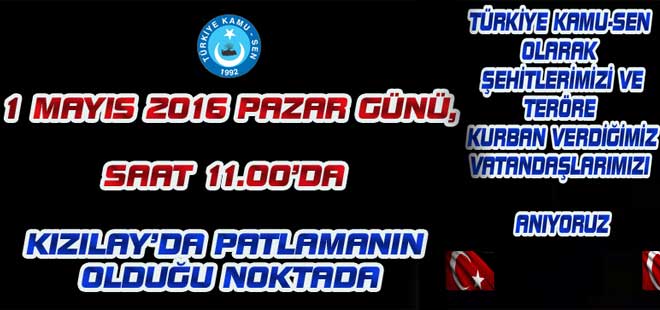 Türkiye Kamu-Sen ve Türk Eğitim-Sen Genel Başkanı İsmail Koncuk, Türkiye Kamu-Sen’in, 1 Mayıs Emek ve Dayanışma Bayramı’nda, 13 Mart 2016 tarihinde Kızılay’da meydana gelen patlamanın gerçekleştiği ve 34 vatandaşımızın şehit edildiği durakta olacağını ve kırmızı karanfillerle şehitlerimizi anacağını açıkladı.