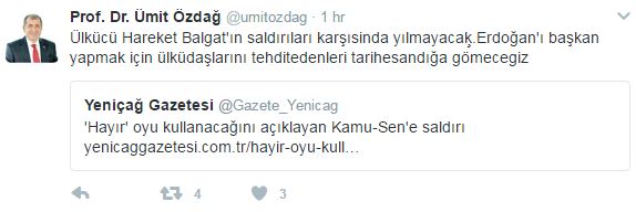 MHP Genel Başkan Adayı ve Gaziantep Milletvekili Prof. Dr. Ümit Özdağ da Kamu-Sen'e yapılan saldırıya çok sert tepki gösterdi. Sosyal medya hesabından bir açıklama yapan Özdağ, "Ülkücü Hareket Balgat'ın saldırıları karşısinda yılmayacaķ. Erdoğan'ı başkan yapmak için ülküdaşlarını tehdit edenleri tarihe sandığa gömeceğiz" ifadelerini kullandı.