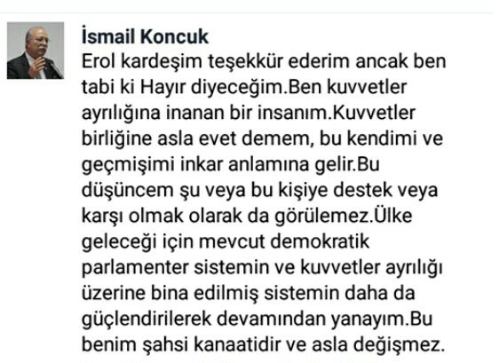 Türkiye Kamu-Sen ve Türk Eğitim-Sen Genel Başkanı İsmail Koncuk, son günlerde çok tartışılan başkanlık sistemi ile ilgili görüşlerini belirterek, Parlamenter sistemin güçlendirilerek devam ettirilmesini gerektiğini ve referandumda 'hayır' oyu vereceğini açıklamıştı.