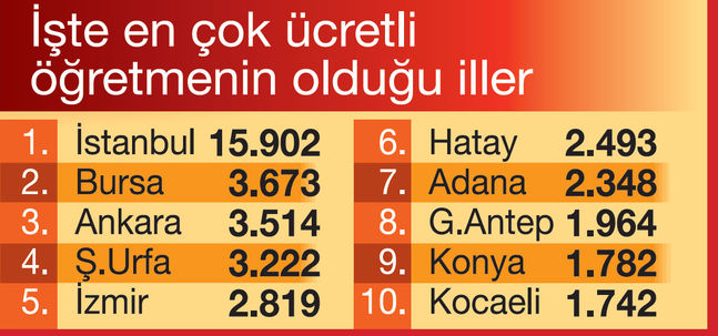 Türk Eğitim-Sen'in 69 ilde yaptığı araştırmaya göre Türkiye'de sayıları 71 bin 960 olan ücretli öğretmen sayısında rekor ise İstanbul'da. Kentte ücretli öğretmen sayısı 15 bin 902. Bu rakam ile İstanbul ücretli öğretmende 68 ili geride bıraktı.