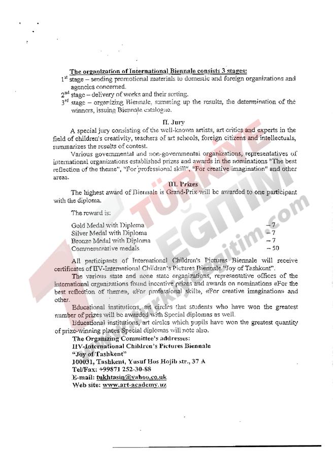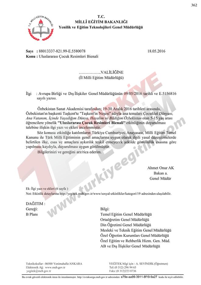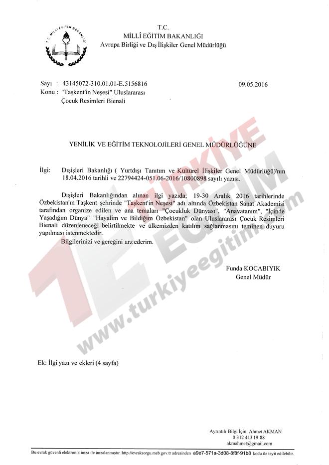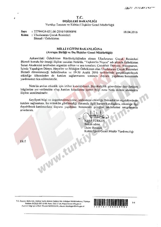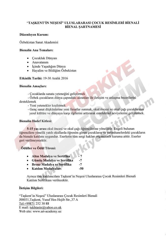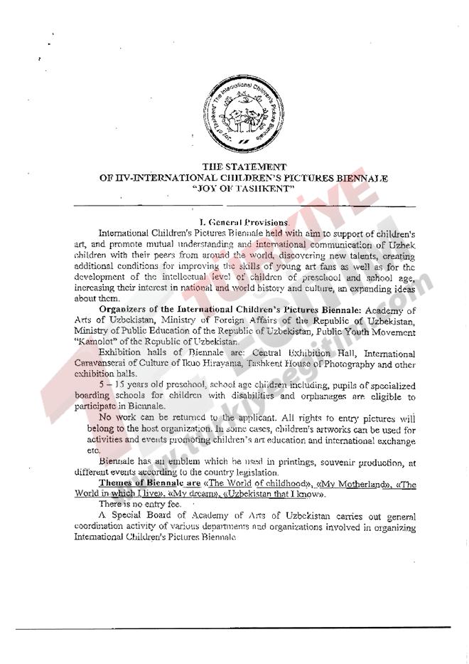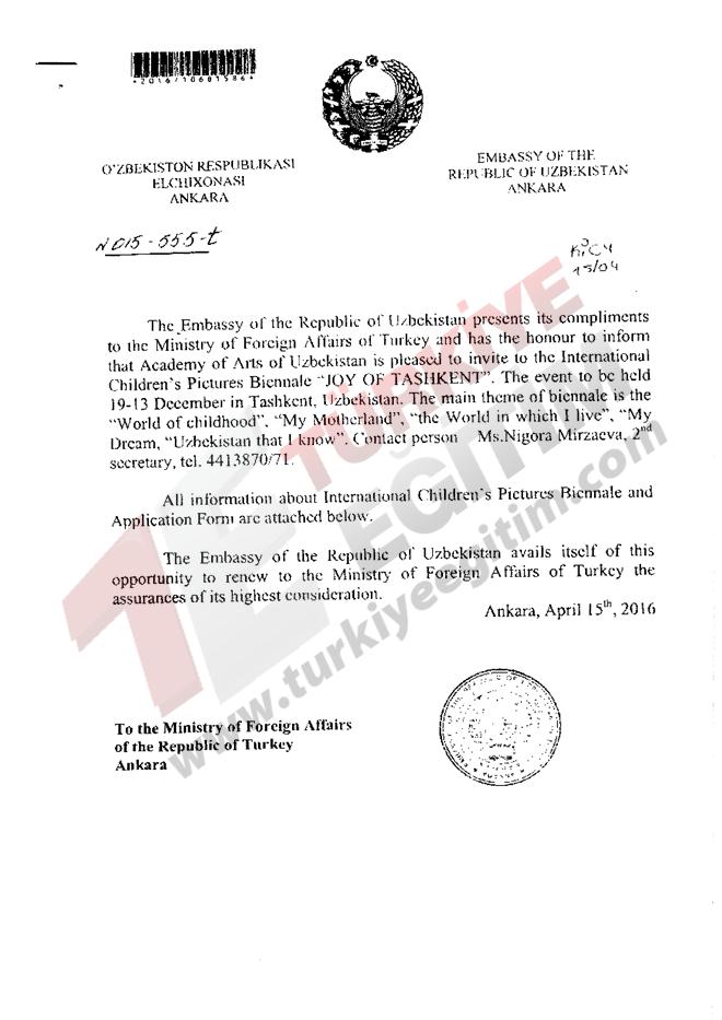 Özbekistan Sanat Akademisi tarafından; 19-30 Aralık 2016 tarihleri arasında, Özbekistan'ın başkenti Taşkent'te "Taşkent'in Neşesi" adıyla ana temaları Çocukluk Dünyası, Ana Vatanım, İçinde Yaşadığım Dünya, Hayalim ve Bildiğim Özbekistan olan 5-15 yaş arası öğrencilere yönelik "Uluslararası Çocuk Resimleri Bienali” etkinliğinin duyurulması talebine ilişkin ilgi yazı ve ekleri incelenmiştir.