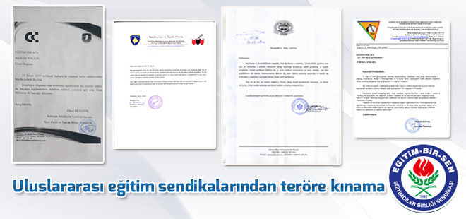 Fas Ulusal Eğitim Çalışanları Sendikası, Filistinli Öğretmenler Birliği, Yurt Dışı Filistinli Mesleki Grup ve Birlikleri, Cezayir Ulusal Öğretmenler Sendikası, Malezya Eğitim Organizasyonu, Arnavutluk Bağımsız Eğitim Sendikası, Hırvatistan Öğretmenler Sendikası, Sırbistan Sendikalar Konfederasyonu, Suriye Öğretmenler Birliği Sendikası’ndan Eğitim-Bir-Sen’e gelen kınama ve destek mesajlarına karşılık olarak Eğitim-Bir-Sen ve Memur-Sen Genel Başkanı Ali Yalçın, kendilerine teşekkür mektubu gönderdi.
