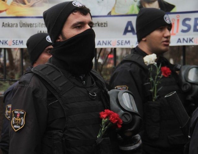 Kampüsün giriş kapısı önüne gelen öğrenciler, burada yürüyüşün güvenliği için önlem alan çevik kuvvet polislerine kırmızı ve beyaz karanfiller verdi. Bazı öğrenciler polislere sarıldı.