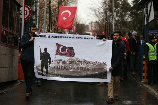Ankara Üniversitesi Cebeci Kampüsünde ellerinde Türk bayraklarıyla toplanan öğrenciler, "Şehitler ölmez, vatan bölünmez" sloganları atarak yürüyüşe geçti.