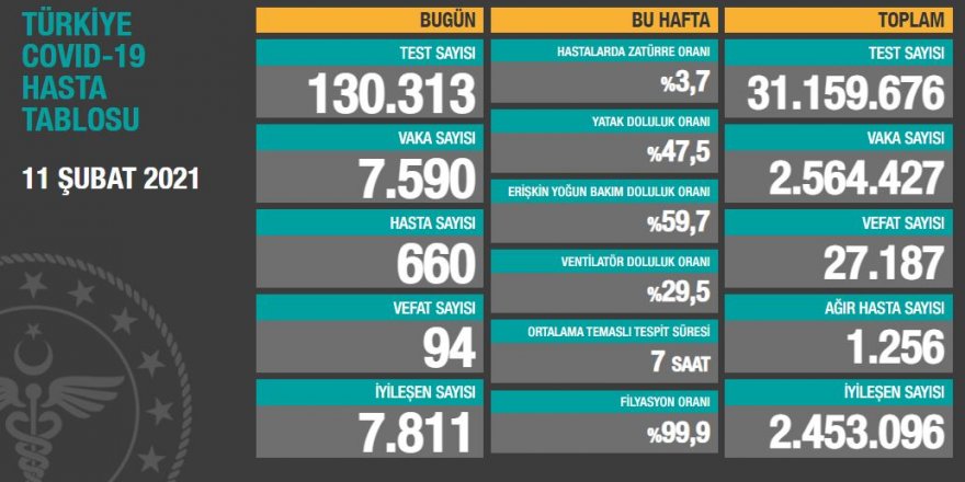Türkiye'de son 24 saatte 130 bin 313 Kovid-19 testi yapıldı, 7 bin 590 kişinin testi pozitif çıktı, 94 kişi hayatını kaybetti.
