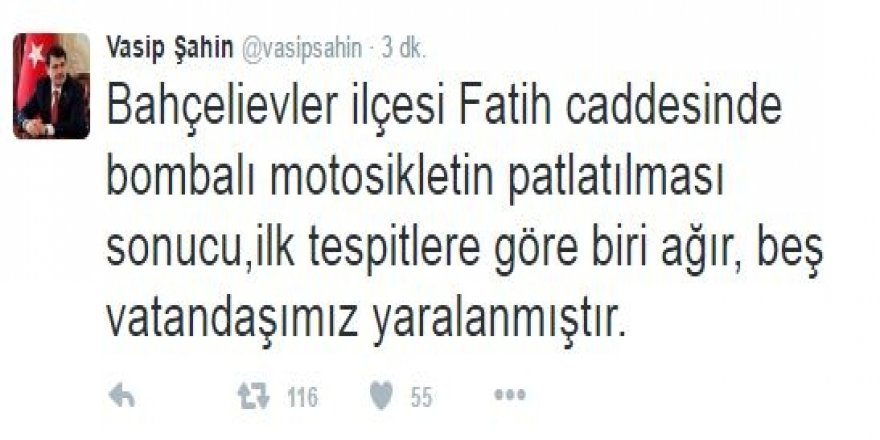 Vali Şahin, sosyal paylaşım sitesi Twitter hesabından yaptığı açıklamada, "Bahçelievler ilçesi Fatih Caddesi'nde bombalı motosikletin patlatılması sonucu ilk tespitlere göre biri ağır 5 vatandaşımız yaralanmıştır." ifadesine yer verdi.