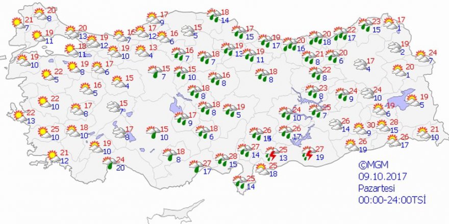 Yurtta hava durumu 09 Ekim 2017 Pazartesi