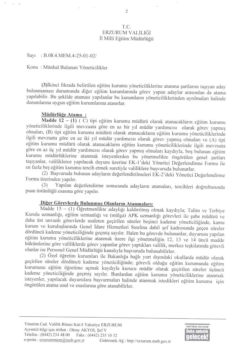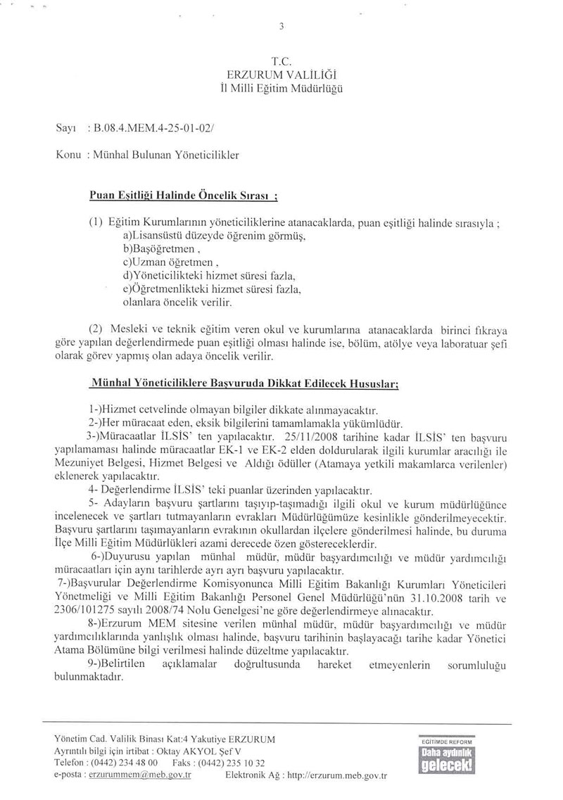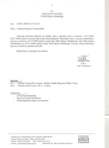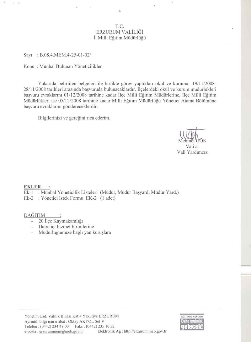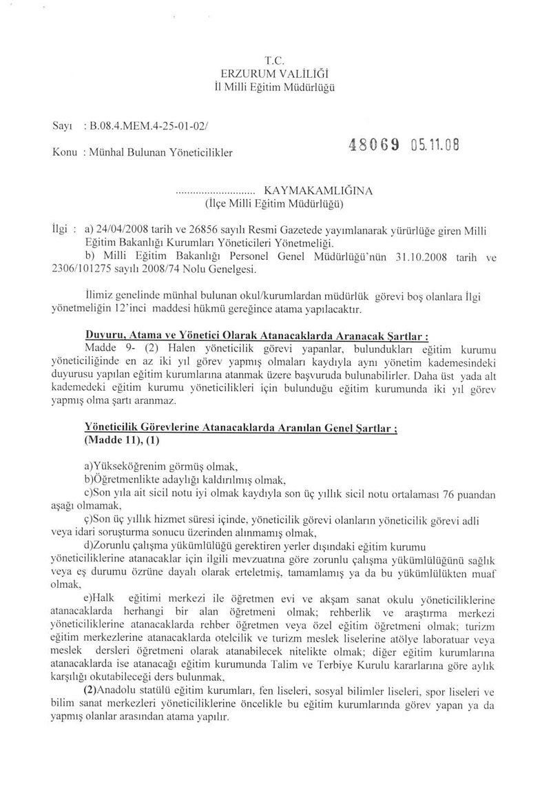 31 Ekim 2008 tarihinde yayınlanan Genelge gereği Yönetici Atama işlemleri başladı. Erzurum Valiliği'nin yazısı için tıklayınız.