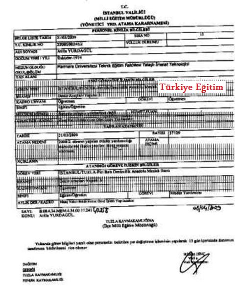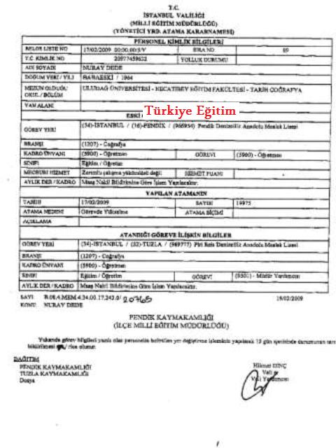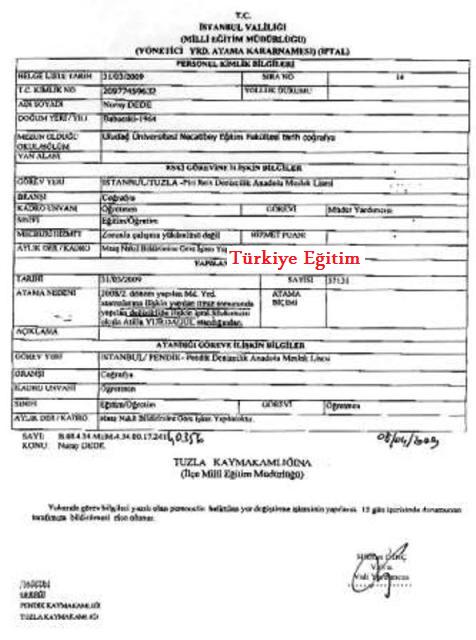 Pendik Denizcilik Anadolu Meslek Lisesi Coğrafya Öğretmeni Nuray Dede'nin iptal kararnamesine atanma nedeni bölümüne 2008/2. dönem yapılan Müdür Yardımcısı atamalarına ilişkin yapılan itiraz sonucunda yapılan değişikliğe ilişkin iptal. Söz konusu okula Atilla Yurdagül atandığından yazılırken itirazı sonucu İl Milli Eğitim Müdürlüğü tarafından yanlış atama yapıldığı kabullenilen Tuzla Piri Reis Denizcilik Anadolu Meslek Lisesi yeni Müdür Yardımcısı Atilla Yurdagül'ün 08.04/2009 tarih ve241/40358 sayılı kararnamede atanma nedenine 2008/2 dönem atamalarına itiraz sonucu atanması denildi.