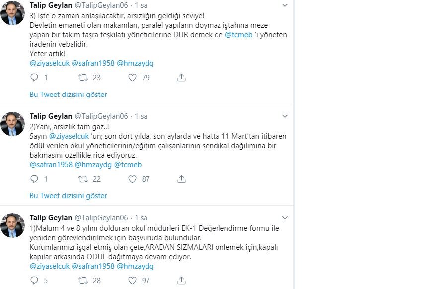 Türk Eğitim Sen Genel Başkanı Talip Geylan, sosyal medya hesabından Milli Eğitim Bakanlığına çağrıda bulunarak Ödül Verilen Okul Yöneticilerinin Sendikal Dağılımına Bakılsın dedi.