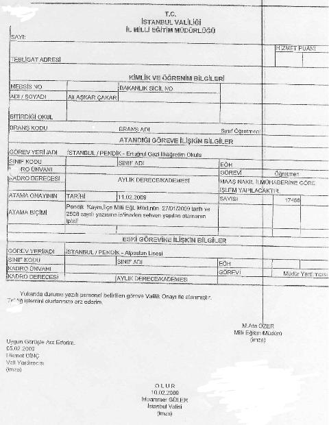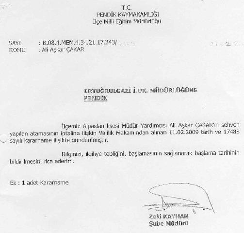 Pendik Ertuğrul Gazi İlköğretim Okulu Sınıf Öğretmeni Ali Aşkar Çakar, 26.03.2005 Müdür Yardımcılığı Sınavında 71.450 puan alarak 2008'de yapılan Müdür Yardımcılığı atamalarına başvurdu. Pendik Alparslan Lisesi Müdür Yardımcısı olarak atanan ve göreve başlayan öğretmene aradan 5 ay geçtikten sonra atamanız Sehven yapılmıştır denilerek kararnamesi iptal edildi ve eski okuluna gönderildi.