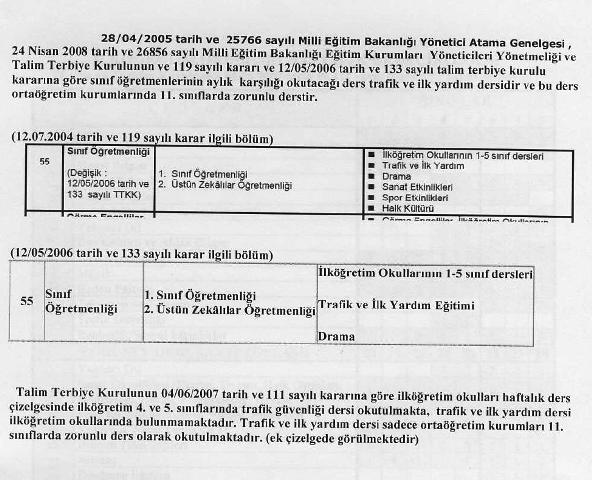 Talim Terbiye Kurulu; 12.07.2004 tarih ve 119 sayı, 12.05.2006 tarih ve 133 sayı ve 17.09.2007 tarih ve 155 sayılı kararlarında Milli Eğitim Bakanlığı Eğitim Kurumlarına Yönetici Olarak Atanacaklara İlişkin Esaslar belirlenmiştir. Bu karalarda Sınıf Öğretmenlerinin aylık karşılığı okutacakları derslere ilişkin Trafik ve İlk Yardım Eğitimi dersi bulunmaktadır. Talim Terbiye Kururunun 04.06.2007 tarih ve 111 sayılı kararına göre ilköğretim okullarında okutulacak haftalık ders çizelgesinde 4. ve 5. sınıflarda Trafik ve İlk Yardım Eğitimi dersi zorunlu ders olarak bulunmaktadır. Ayrıca Orta Öğretim Kurumlarının 11. sınıflarında da Trafik ve İlk Yardım Eğitimi zorunlu ders olarak okutulmaktadır. Bu açıdan değerlendirildiğinde Talim Terbiye Kurulunun aylık karşılığı okutulacak derslere ilişkin tasnifine aykırılık gözükmemektedir.