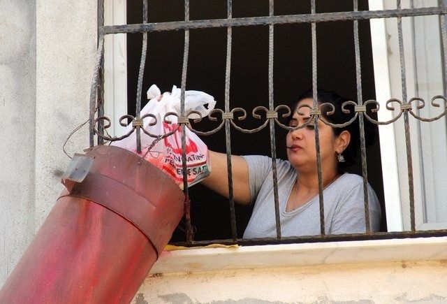 Mutfağın penceresine kadar uzanan borudan çöpleri aşağıdaki konteynere atan Serap Sarı, "Görenler gülümsüyor, çok olumlu tepkiler alıyoruz" dedi.