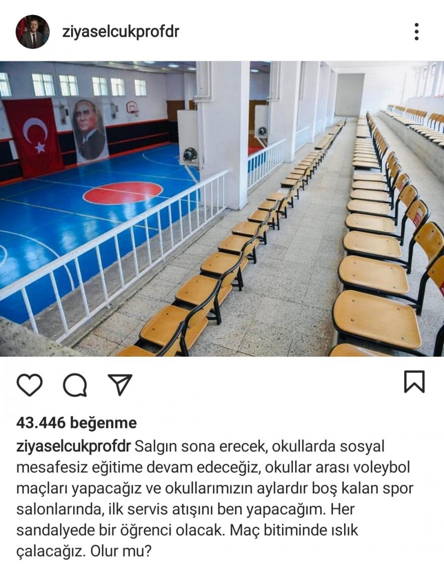 Bakan Selçuk, sosyal medya hesabından boş bir spor salonunun fotoğrafını paylaştı. Selçuk mesajında ise "Salgın sona erecek, okullarda sosyal mesafesiz eğitime devam edeceğiz, okullar arası voleybol maçları yapacağız ve okullarımızın aylardır boş kalan spor salonlarında, ilk servis atışını ben yapacağım. Her sandalyede bir öğrenci olacak. Maç bitiminde ıslık çalacağız. Olur mu?" ifadelerine yer verdi.