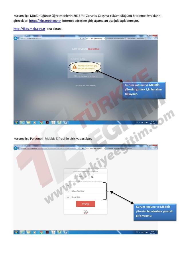 Kurum/İlçe Müdürlüğünce Öğretmenlerin 2016 Yılı Zorunlu Çalışma Yükümlülüğünü Erteleme Evraklarını girecekleri http://ikbs.meb.gov.tr internet adresine giriş aşamaları aşağıda açıklanmıştır.